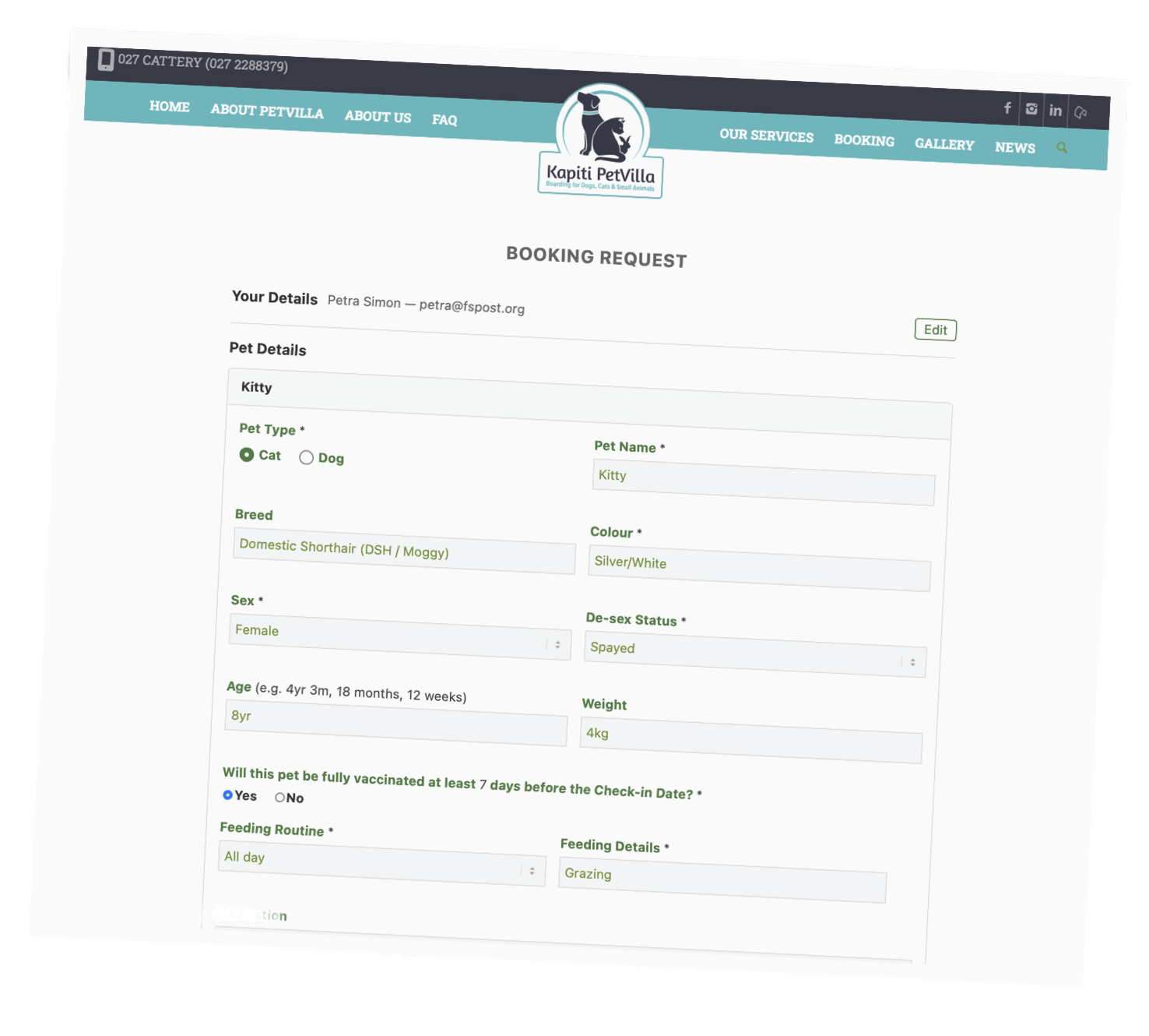 The form collects everything your facility needs — dates, pet details, breed, age, weight, feeding requirements, medication needs, behavioural notes, and vaccination status. It only shows dates that are available, and suggests fitting accommodation types based on the pet.